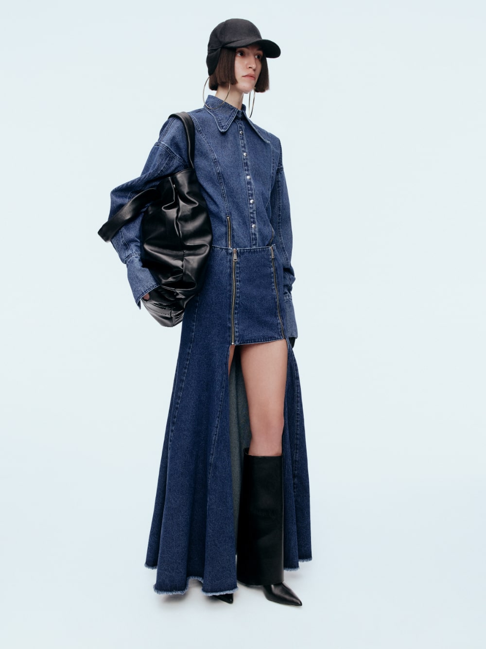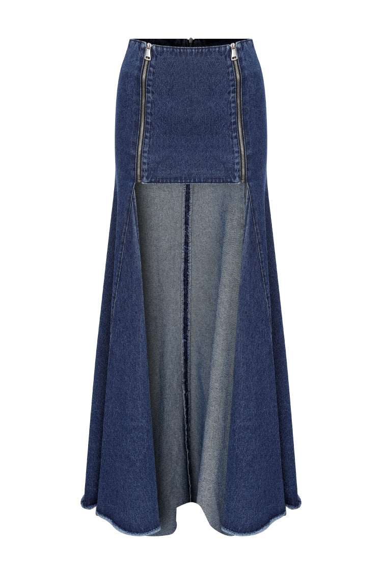 This asymmetrical denim skirt features an innovative silhouette with a mini-length front and elongated back, creating a dramatic, contemporary profile. Refined zipper details at the front and sides elevate the classic denim construction, offering both distinctive style and practical functionality. A sophisticated interpretation of casual denim that transitions effortlessly from day to evening.