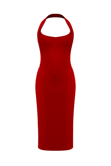 Embrace architectural elegance with this sculpted corset midi dress, designed to define and flatter your silhouette. The structured bodice creates a refined hourglass shape, while the midi length offers timeless sophistication. A sleek metal zip runs down the back for a modern edge, complemented by a subtle back slit that adds movement and allure. Perfect for elevated occasions where polished style meets contemporary design.