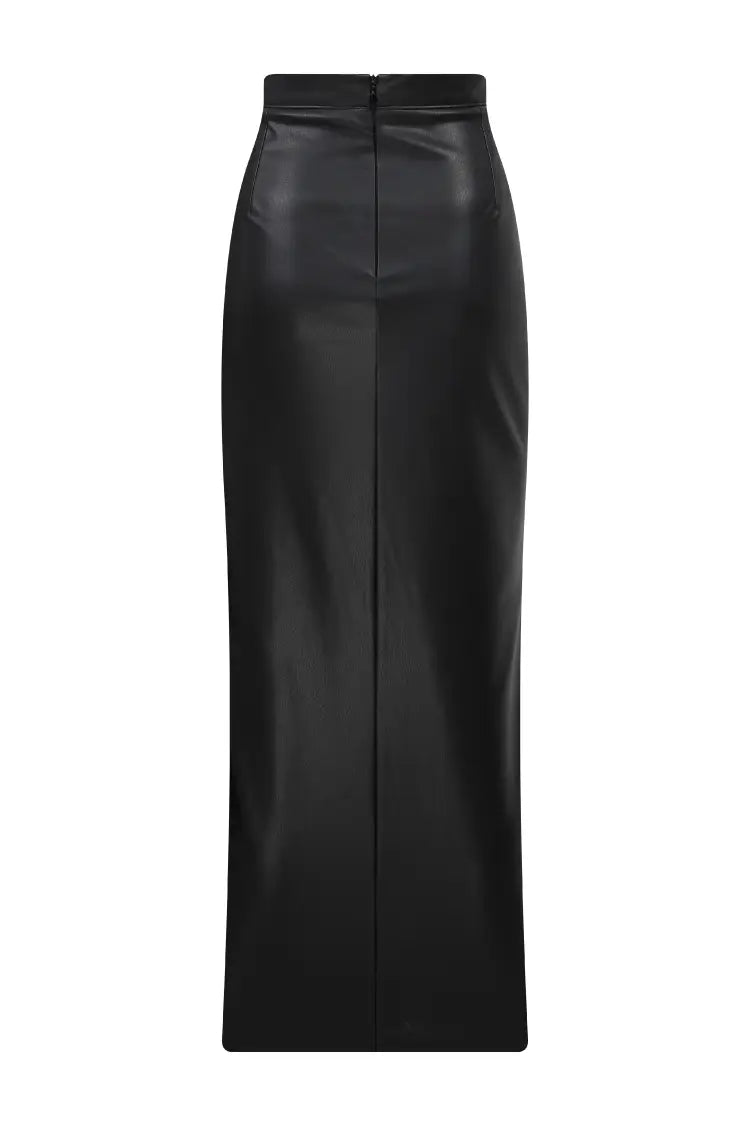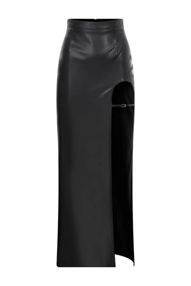 Wrap yourself in luxury with our BELT DETAILED PENCIL SKIRT. Crafted from supple leather, this pencil skirt is adorned with a sleek belt and a deep open slit. Elevate your style with this sophisticated and exclusive piece, perfect for the world of art, literature, and fashion.