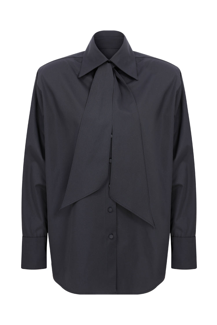 Indulge in the luxurious appeal of our BOW SHIRT. This loose fit, sophisticated shirt features a delicate bot detail at the neck, exuding elegance and exclusivity. Perfect for adding an artistic touch to any outfit, it is a must-have piece for the fashion-forward individual.