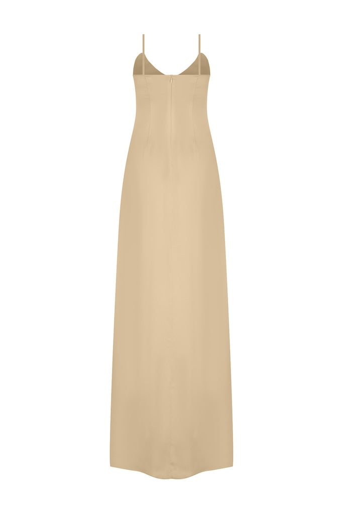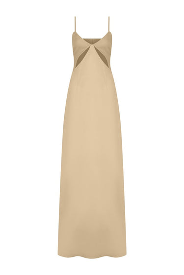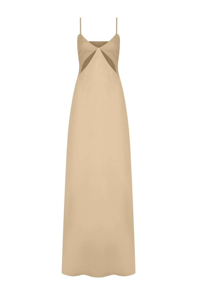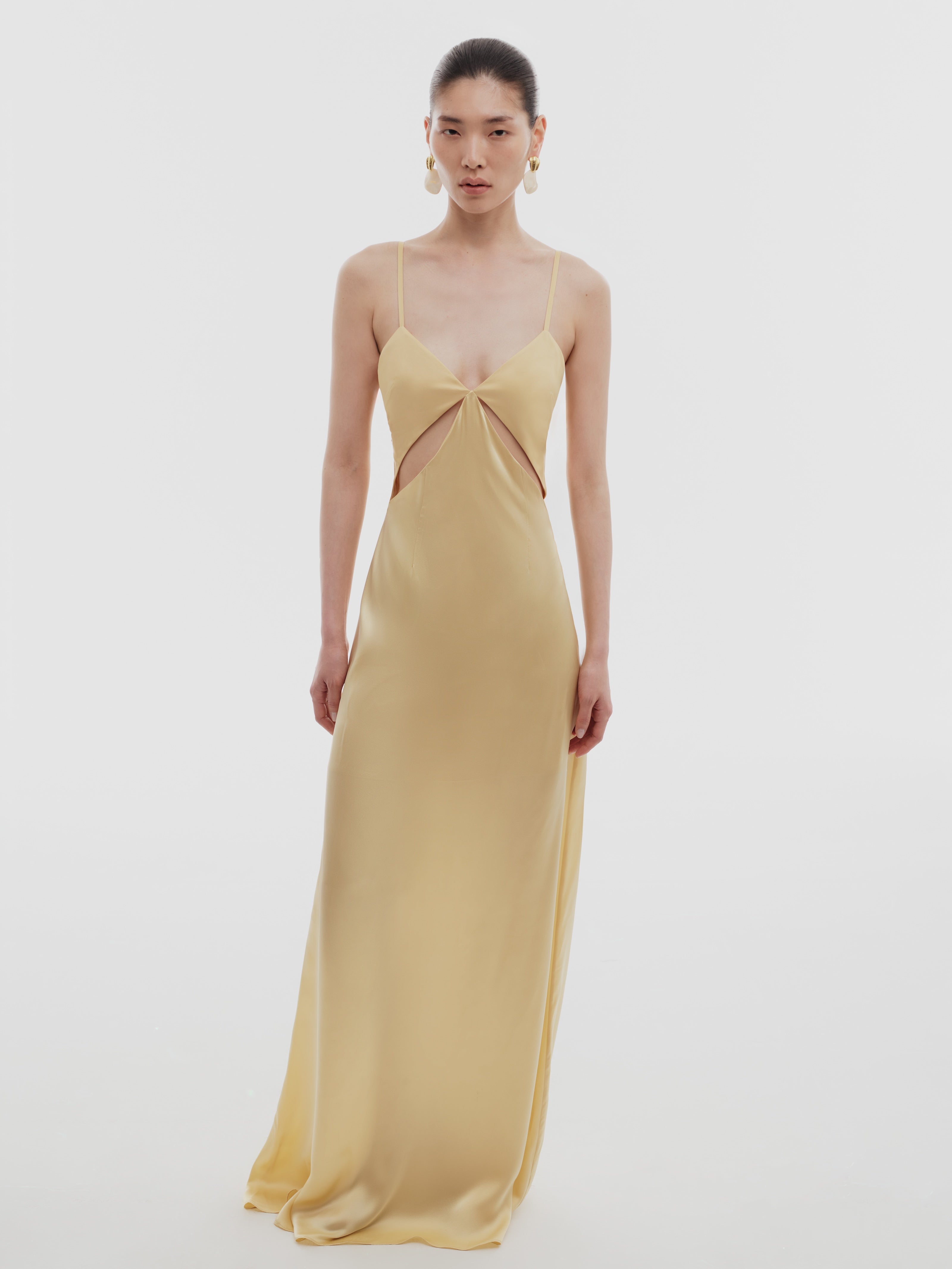 This elegant silk dress features tasteful cut-out details that add a modern edge to its timeless silhouette. Crafted from smooth, luxurious silk, it drapes beautifully for a flattering fit. Perfect for sophisticated occasions, this dress combines refined style with subtle allure.