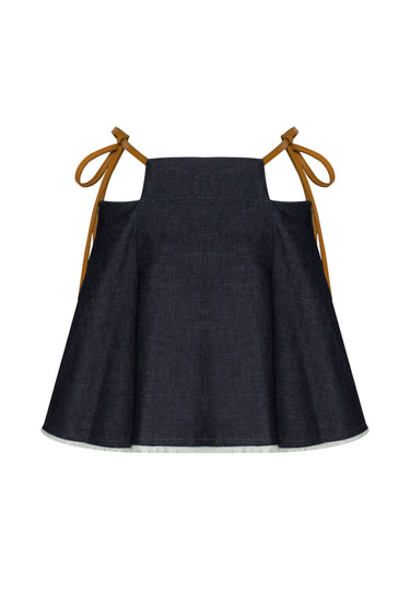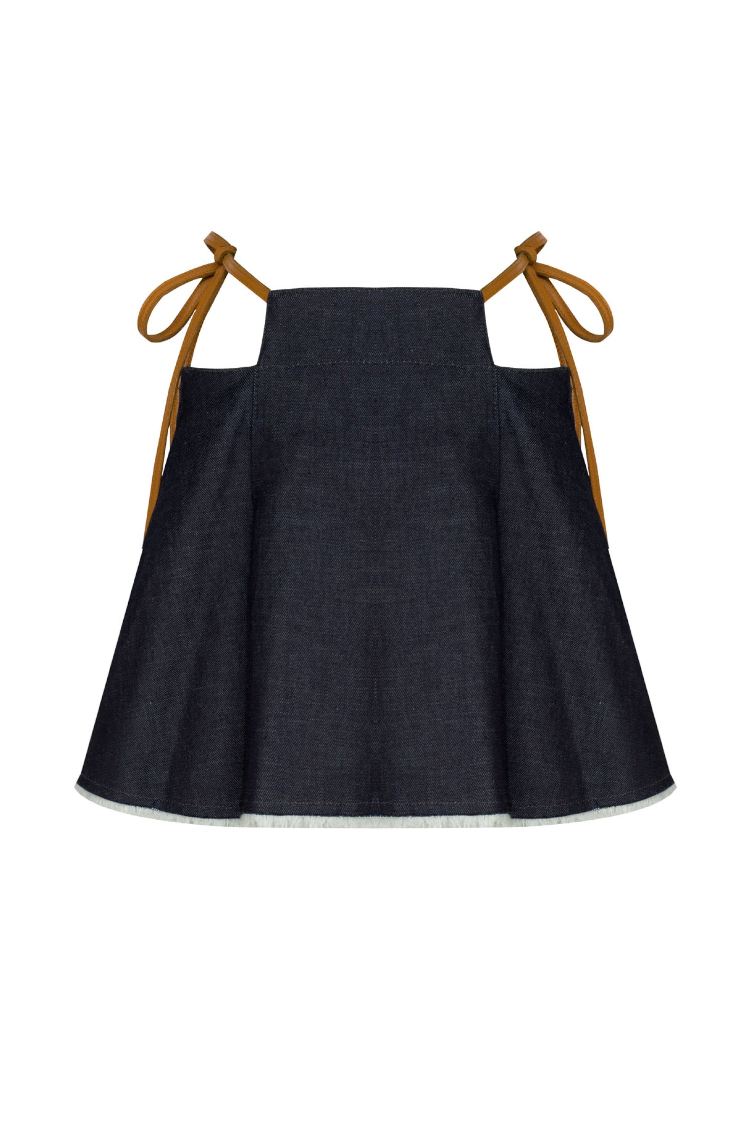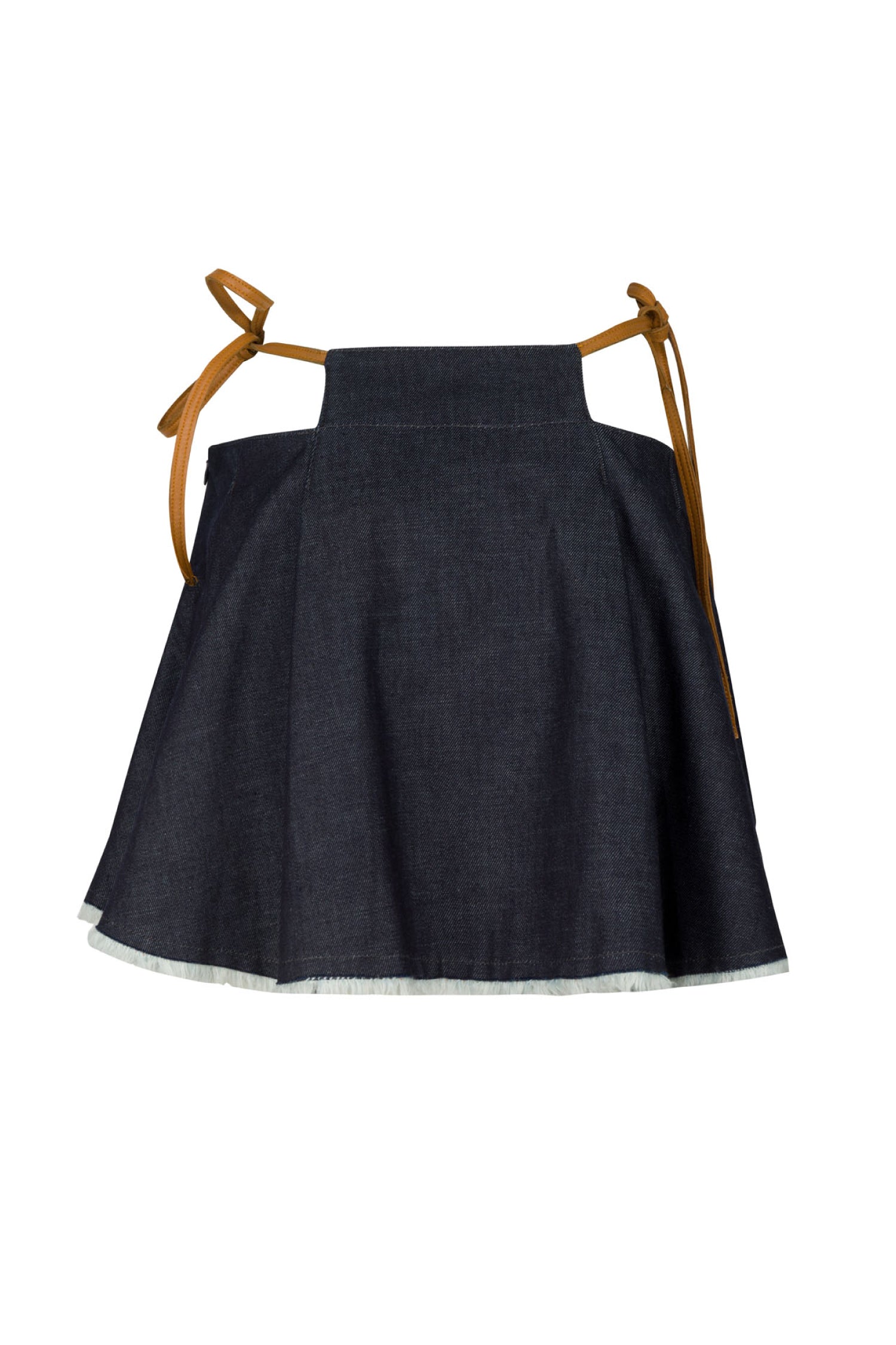 This sophisticated pleated denim mini skirt elevates casual style with refined leather trim details along the sides. The thoughtful tied accents create a tailored silhouette that transitions effortlessly from day to evening. A versatile wardrobe essential that balances contemporary design with timeless appeal.